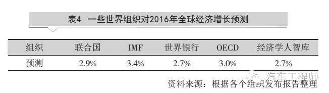 綜合這些因素,全球汽車市場將繼續(xù)保持微弱增長態(tài)勢,一些預(yù)測機(jī)構(gòu)對(duì)2016年增長率的預(yù)測也大致保持在2.5%~3%之間:杜伊斯堡-埃森大學(xué)汽車研究所認(rèn)為在低油價(jià)的刺激下,2016年全球小汽車新車銷量將額外增加60萬輛,整體比2015年增長2.5%;標(biāo)準(zhǔn)普爾預(yù)計(jì)2016年全球汽車銷售量將增長3%左右; 《經(jīng)濟(jì)學(xué)人》 預(yù)計(jì)2016年全球汽車市場銷量將增長3.1%左右。