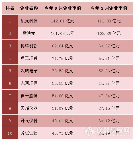 綜上可看出,除雪迪龍市值有小幅下滑外,其他9家企業(yè)市值均出現(xiàn)了明顯上漲。尤為值得一提的是聚光科技,半年內(nèi)在超百億市值的基礎(chǔ)上再增30多億市值,從而穩(wěn)居本次排行榜榜首。此外,博暉創(chuàng)新半年內(nèi)也有超20億元市值增幅,從而超越理工環(huán)科進(jìn)入前三甲位置。