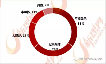 PVD鍍膜技術(shù)作為制備薄膜材料的主流技術(shù),目前已被廣泛用于制備各種具有特定功能的薄膜材料。在PVD鍍膜材料兩大系列產(chǎn)品中,濺射鍍膜已成為比較主要的薄膜材料制備方法,濺射靶材也是目前市場(chǎng)應(yīng)用量比較大的PVD鍍膜材料。20世紀(jì)90年代以來,隨著消費(fèi)類電子產(chǎn)品等終端應(yīng)用市場(chǎng)的快速發(fā)展,濺射靶材的市場(chǎng)規(guī)模日益擴(kuò)大,呈現(xiàn)高速增長(zhǎng)的勢(shì)頭。新思界發(fā)布的《2017年P(guān)VD鍍膜材料行業(yè)投資可行性分析報(bào)告》顯示,2016年全球高純?yōu)R射靶材市場(chǎng)規(guī)模約為113.6億美元,其中平板顯示(含觸控屏)用靶材占比約35%,記錄媒體靶材為29%,太陽能電池用靶材占比為18%,半導(dǎo)體用靶材占比約11%,如圖1所示: